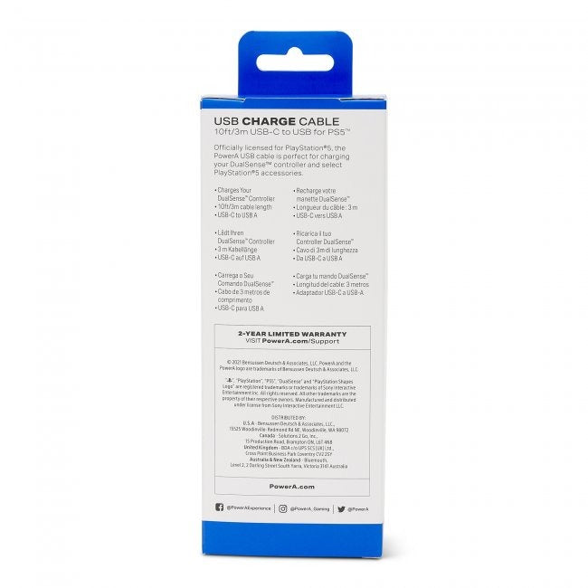 Keep your DualSense controller charged and ready for gaming with the officially licensed USB Charging Cable for PlayStation 5 by PowerA. This 10ft cable is perfect for charging your controller while your PlayStation4 console is on standby or even while you play. Made with ferrite coil and gold plated connectors, this USB Charging Cable was designed to last. Works with DualSense controllers 10ft Cable with velcro-strap Standard USB to USB-C Officially licensed for PlayStation 5.